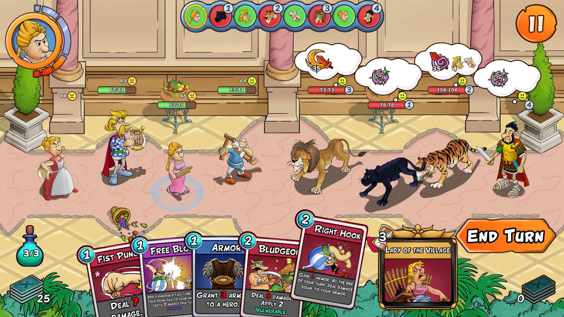 Мне очень нравится эта игра, но… Время ожидания анимации просто смехотворно, музыка может быть болезненной… я обычно просто выключаю ее, нет озвучки, а диалоги грубые, хотя все вроде бы в характере. Я также не понимаю, почему независимо от того, кто находится в вашей партии, Астерикс — это игрок, которого вы видите передвигающимся по игровому полю. Несмотря на все это, это длинный, веселый карточный батлер, и я бы полностью рекомендовал его тем, кому нравится этот жанр. Играть очень приятно, особенно когда вы используете синергетические комбинации карт и уничтожаете римлян. Кроме того, возможность открыть тонну персонажей без необходимости доплачивать за dlc — это замечательно. Есть тонны карт и множество причин вернуться к ним с разными персонажами и комбинациями карт. До того как попробовать эту игру, я ничего не знал об Астериксе и Обеликсе, но игра вдохновила меня на просмотр фильмов — банально, но весело. Теперь я хочу посмотреть комиксы, я знаю, что персонажи существуют уже давно. Я не думал, что получу от игры такое удовольствие, какое получил. Так что даже если вы не увлекаетесь французскими комиксами, я все равно рекомендую вам эту игру, если вы любитель колодостроения/карточных баталий.
